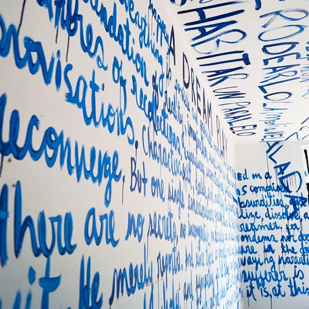 Instalación texto sobre techo y paredes, acrílico azul, 2018.