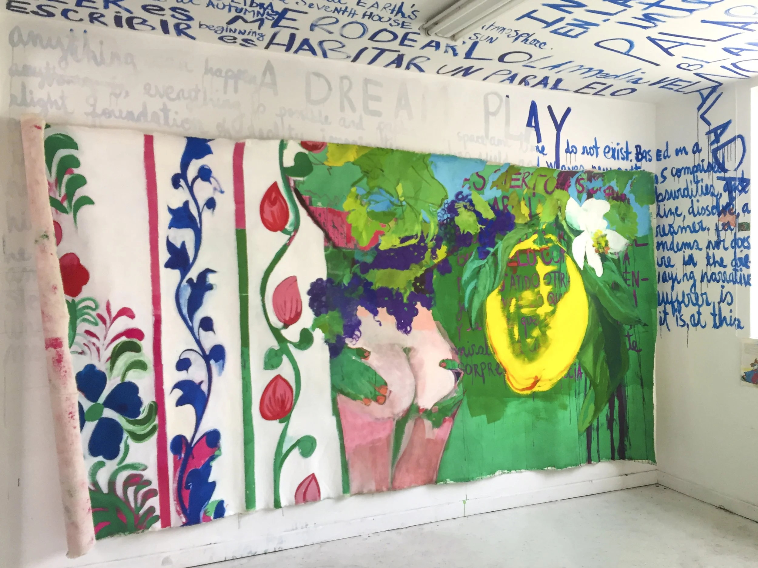 Instalación texto sobre techo y paredes, acrílico azul. India Tropical, acrílico y óleo sobre tela, 2018.