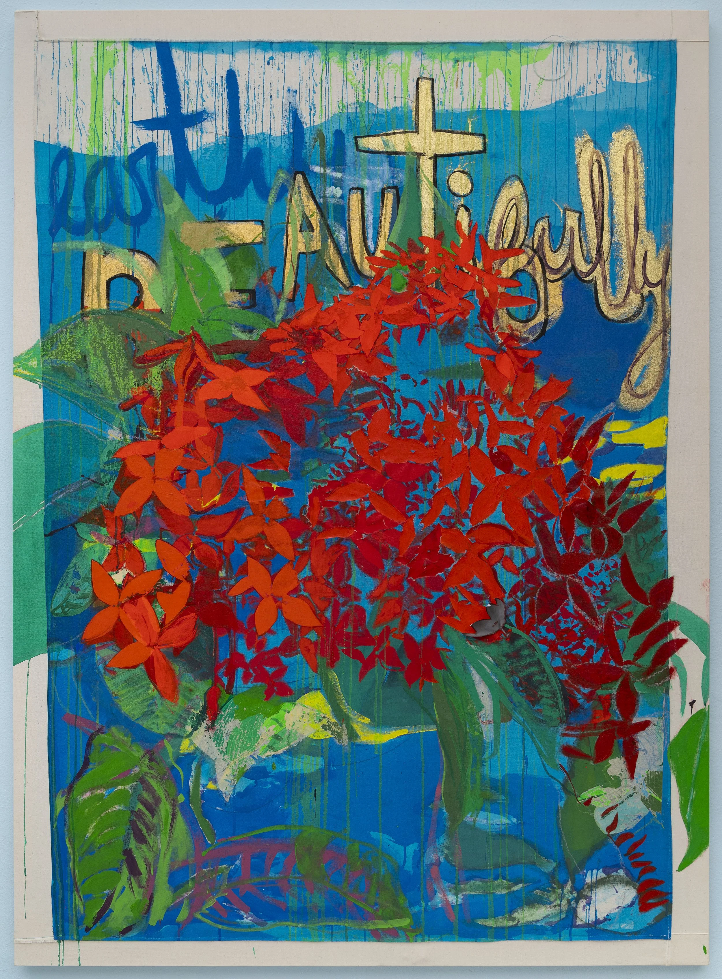 Beautifully, Óleo, acrílico, pastel, papel e hilo sobre tela 194 x 140 cms 2022-2024.