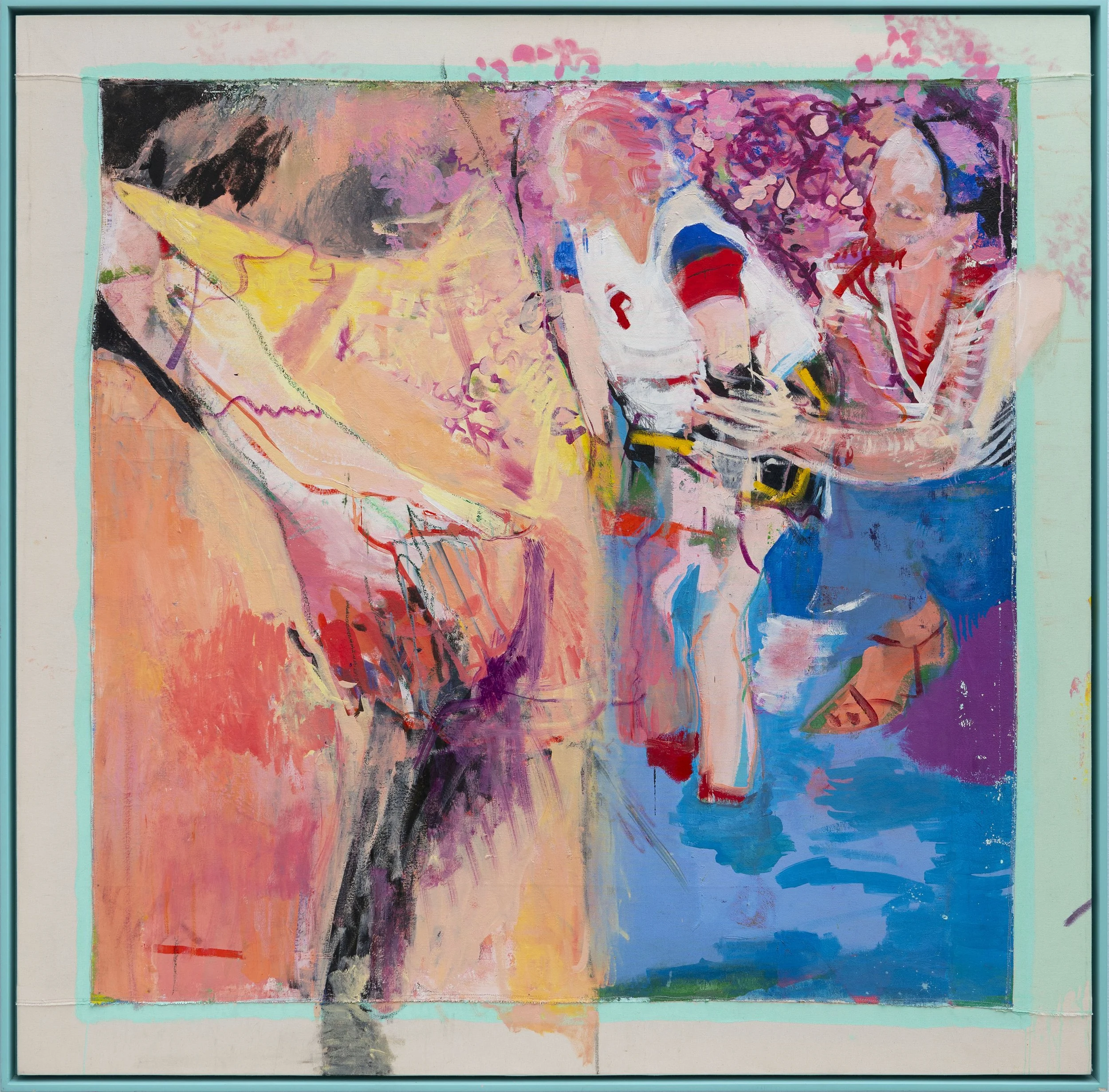 Abrazo, Óleo, acrílico, pastel e hilo sobre tela 150 x 150 cms 2020-2023.