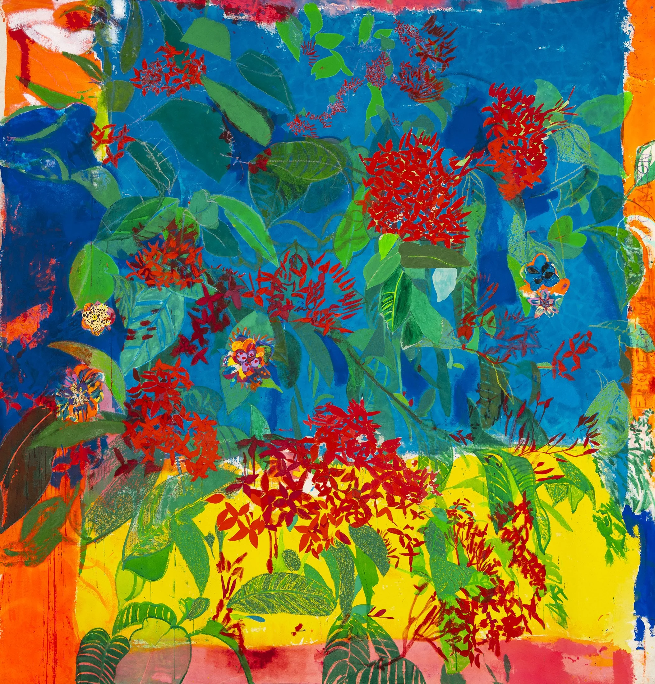 Llama de la jungla, Óleo, acrílico, pastel, papel recortado y tela recortada sobre algodón 245 x 240 cms 2023.